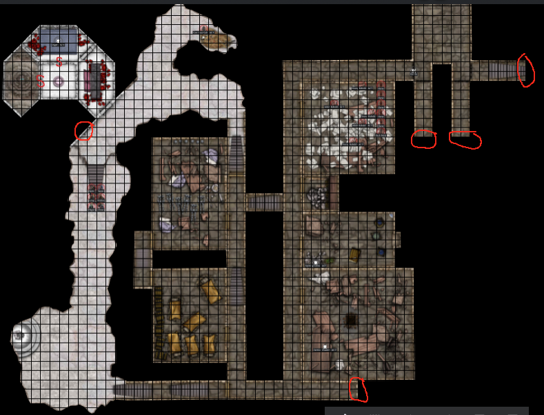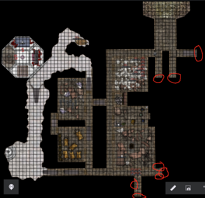 Your hike back to the Kobolds is fairly uneventful. As you pass by the young cave bear’s passageway, you hear it snoring, and it is not disturbed by your passing. You see and hear no other creatures in the hallways. Weert, Hagar, and Leng feel their strength and constitution (from the laughing pendant) return to them as you are walking. The Kobolds seem happy to see you again, and you have an uneventful and restful night. Weert and Leng regain their spells overnight, and are prepared for spell casting for the next day. You pay the Kobolds another gold piece for them to continue to care for the horses for another day. Next Step: Take a look at the last big map where I circled areas you had not explored as you decide where to explore next. The three passageways to the east will require opening 2 portcullises each in order to explore them, remember that when they dropped before, they made loud noises that may have attracted the goblin patrols. The red circle to the south was an unexplored archway. Describe how you will proceed and then roll .turn dice.