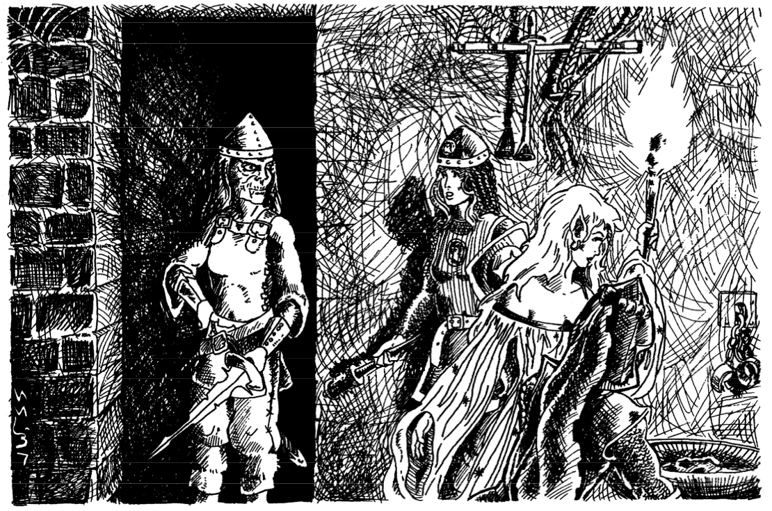 “I suggest we head to yonder door south, the one on the left. Let’s go as quietly as possible and be sure to listen before opening the door (assuming it is unlocked)” says Hagar to the others. (edited)